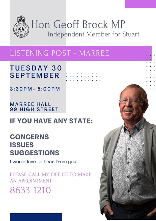 Independent Member for Stuart, Hon Geoff Brock MP, is coming to Marree on Tuesday 30 September 2025 as part of his Listening Post series.