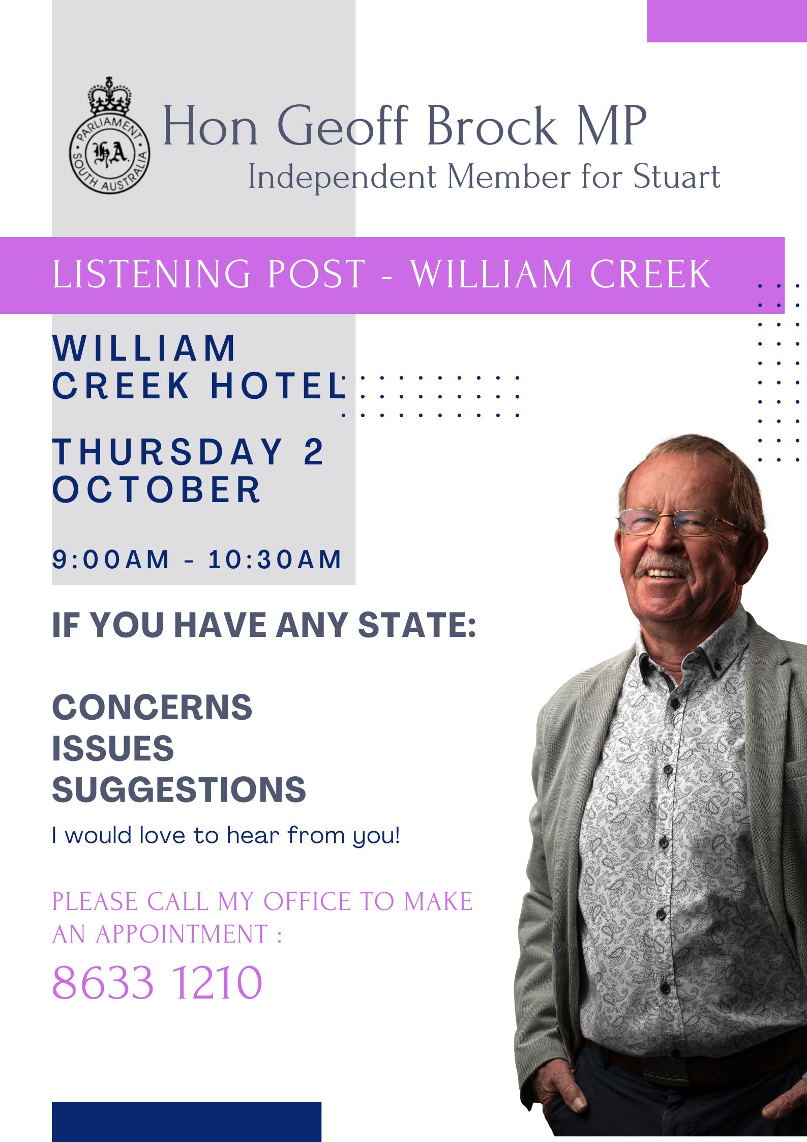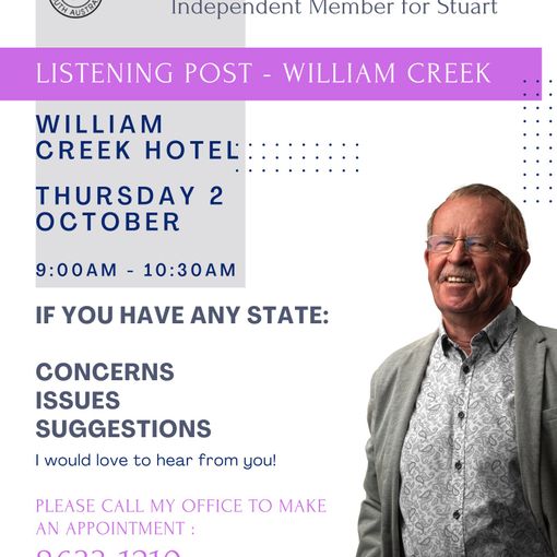Independent Member for Stuart, Hon Geoff Brock MP, is coming to William Creek Thursday 2 October 2025 as part of his Listening Post series.